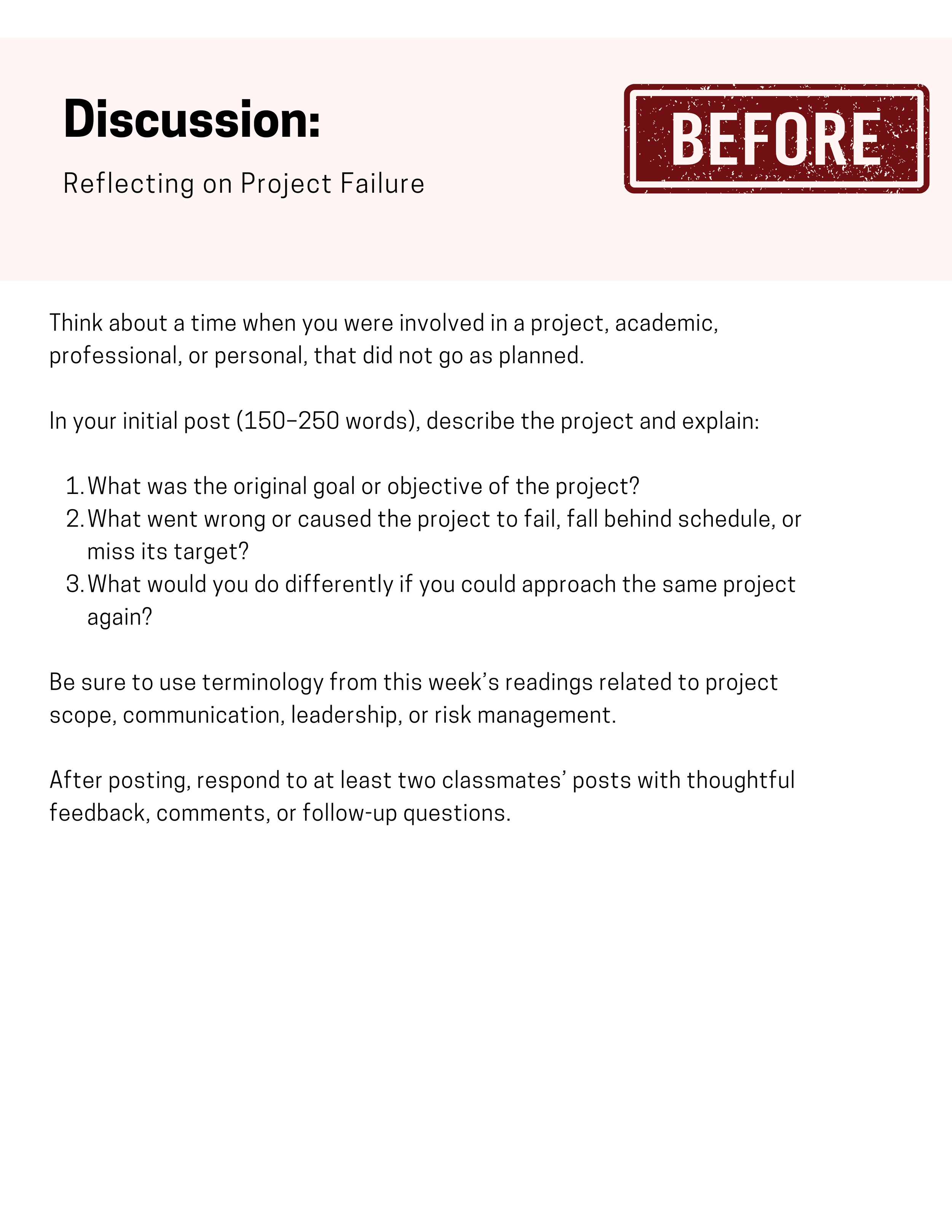 Not all assignments inspire curiosity. Many are designed to check a box, functional, but forgettable. The “before” example here is a typical project management discussion prompt: clear and practical, yet lacking the spark that draws learners in.